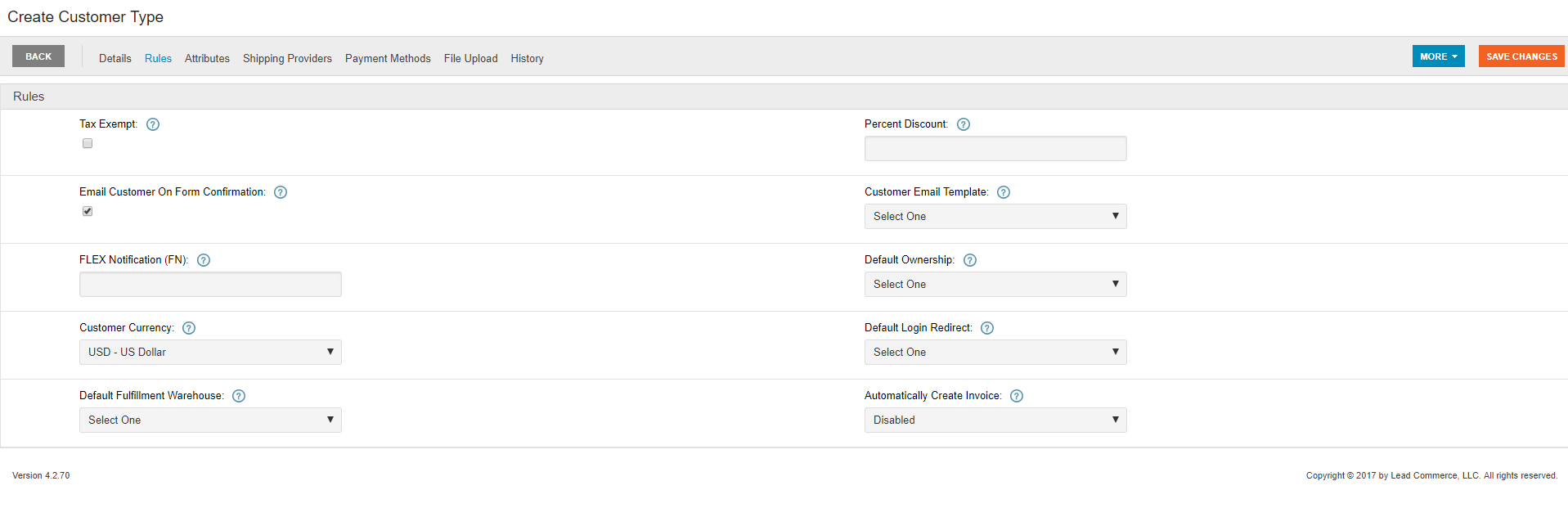Under the Rules tab, you can designate tax exempt status, account ownership, percent discount (i.e. tiered pricing), default log in redirect for your eCommerce site, and whether or not they are an auto-invoice customer.